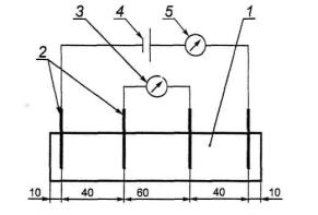 1 - образец из бетона; 2 - электроды (стальные скобки); 3 - вольтметр; 4 - источник тока; 5 - микроамперметр Рисунок 2 - Установка для измерения электрического сопротивления образцов из бетона