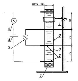 1 - штатив; 2 - электроды; 3 - вольтметр; 4 - источник тока; 5 - микроамперметр; 6 - трубка из неэлектропроводного материала; 7 - пробка; 8 - водная вытяжка Рисунок 3 - Установка для измерения электрического сопротивления водной вытяжки из бетона 7.3.2 Применяют следующие приборы: - источник постоянного тока с регулируемым напряжением от 1 до 100 В; - вольтметр с входным сопротивлением не менее 108 Ом и ценой деления не более 5 мВ; - микроамперметр с максимальной величиной измерения 10 мА и ценой деления 1 мкА; - штатив; - термометр с диапазоном измерений 15 °С - 30 °С и ценой деления 0,1 °С по ГОСТ 13646; - штангенциркуль с ценой деления 0,1 мм; - устройство в виде трубки из электроизоляционного материала с электродами, как показано на рисунке 3. Внутренний диаметр трубки должен быть 10-16 мм, длина трубки - (280 ± 10) мм. 7.4 Проведение испытаний 7.4.1 Образцы в течение 3 сут насыщают дистиллированной водой, повышая уровень воды на 1/3 высоты образца каждые сутки. На третьи сутки верх бетонного образца должен возвышаться над водой на 2-3 мм. 7.4.2 Образцы последовательно извлекают из воды, осушают поверхность бетона влажной тканью и немедленно устанавливают на подкладки из электроизоляционного материала (трубки из стекла или полимерного материала). Измеряют разность потенциалов ΔV0, В, между средними электродами в отсутствие тока. 7.4.3 Подключают источник тока и последовательно соединенный с ним микроамперметр к крайним электродам. Регулируя значение тока источника, устанавливают разность потенциалов ΔV между средними электродами в пределах от 10 до 15 В и измеряют значение тока I в цепи. 7.4.4 С помощью штангенциркуля измеряют с точностью до 0,1 мм высоту h и ширину образца b и расстояние между средними электродами l. 7.4.5 Один из параллельных образцов, не имеющих электродов, высушивают до постоянной массы и дробят до полного прохождения через сито с размером ячеек 0,63 мм. 7.4.6 Из дробленого материала образца отбирают четыре пробы массой (100 ± 1) г каждая и засыпают в четыре стеклянные колбы. 7.4.7 В колбы заливают дистиллированную воду в количестве 100, 250, 500 и 1000 см3 соответственно. Колбы герметично закрывают и оставляют на 72 ч, периодически взбалтывая. 7.4.8 Отстоявшуюся над осадком водную вытяжку, не взбалтывая, сливают через воронку с фильтром в установку (см. рисунок 3). Включают ток и устанавливают между средними электродами разность потенциалов ΔVвв, разную (5 ± 0,5) В. Измеряют значение тока Iвв в цепи. 7.5 Обработка результатов испытаний 7.5.1 По полученным результатам рассчитывают удельное электрическое сопротивление бетона ρб, Ом·см, по формуле