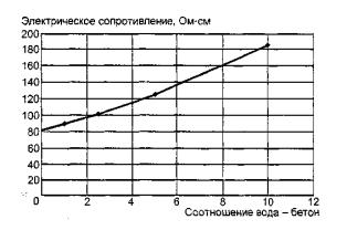 где D - внутренний диаметр трубки в установке, см; l - расстояние между средними электродами в трубке установки, см; П - поправка. Поправку и постоянную прибора определяют по приложению Д. 7.5.3 По полученным результатам строят график в координатах «соотношение вода - бетон» - «электрическое сопротивление» и экстраполируют до точки, где «соотношение вода - бетон» равно нулю. По этой точке определяют электрическое сопротивление жидкой фазы в бетоне (см. рисунок 4).