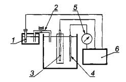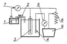 б) Гальванодинамический метод 1 - электрод сравнения: 2 - электролитический ключ; 3 - образец; 4 - вспомогательный электрод; 5 - микроамперметр; 6 - потенциостат; 7 - вольтметр; 8 - резистор; 9 - источник тока Рисунок 5 - Электрические схемы снятия поляризационных кривых 8.3.2 Для проведения измерений гальванодинамическим методом применяют: - вольтметр с минимальным входным сопротивлением не менее 10 МОм и ценой деления не более 5мВ; - источник постоянного тока с диапазоном регулируемого напряжения не менее 5-1000 мВ и тока не менее 1-1000 мкА; - микроамперметр с максимальной величиной измерения не менее 10 мА и ценой деления не более 1 мкА; - резистор с переменным сопротивлением в диапазоне не менее 1-20 МОм; - термометр с диапазоном измерений не менее 10 °С-30 °С с делениями не более 1 °С; - электрод сравнения хлорсеребряный насыщенный образцовый 2-го разряда по ГОСТ 17792; - вспомогательный электрод - стальной стержень диаметром 5-6 мм и длиной 120-150 мм; - сосуд из электроизоляционного материала (стекло, полимерный материал) внутренним диаметром не менее 70 мм и высотой 160-200 мм; - электролитический ключ - стеклянная трубка диаметром 3-5 мм с краном, заполненная насыщенным раствором хлорида калия; - весы лабораторные по ГОСТ 24104 для взвешивания не менее 2 кг с ценой деления не более 1 г. Электрическая схема для измерения гальванодинамическим методом приведена на рисунке 5б). 8.4 Проведение определения 8.4.1 Определения проводят после набора бетоном проектной прочности через 28 сут после изготовления и через 3 и 6 мес испытаний в режиме переменного насыщения водой и высушивания. При измерении используют три параллельных образца. 8.4.2 Режим насыщения и высушивания для каждого бетона устанавливают следующим образом. Неармированные образцы взвешивают, помещают в питьевую воду и, периодически (один раз в сутки) извлекая из воды, взвешивают. Насыщение образцов водой продолжают до тех пор, пока масса образцов не перестанет увеличиваться более чем на 0,1 % первоначальной. Этот период принимают как продолжительность насыщения образцов. Затем образцы помещают в сушильный шкаф при температуре 60 °С и, периодически взвешивая (один раз в сутки), высушивают до первоначальной массы. Этот период принимают как продолжительность высушивания образцов. 8.4.3 Образцы бетона с арматурой до начала измерений насыщают питьевой водой. 8.4.4 На каждом образце проводят только одно измерение. Перед измерением откалывают бетон у торца образца так, чтобы арматурный стержень был обнажен на длине (20 ± 10) мм. Прилежащую к обнаженному стержню поверхность шириной (10 ± 5) мм и выступающую из бетона поверхность стального стержня шириной (10 ± 5) мм окрашивают расплавленной парафиновой мастикой. 8.4.5 Подготовленный образец устанавливают в емкость с питьевой водой так, чтобы верх бетонного образца возвышался над водой на 2-3 мм (см. рисунок 5). Измерение электрохимических характеристик необходимо проводить при температуре воды (25 ± 5) °С. 8.4.6 Измерение тока в микроамперах потенциодинамическим способом (см. рисунок 5а) проводят через (60 ± 5) мин после включения потенциостата. Снимают анодную часть поляризационной кривой со скоростью изменения потенциала 50 мВ/мин до потенциала плюс 1000 мВ с регистрацией силы тока через каждые 50 мВ. 8.4.7 Измерения гальванодинамическим способом (см. рисунок 5б) проводят на образце путем регистрац