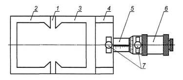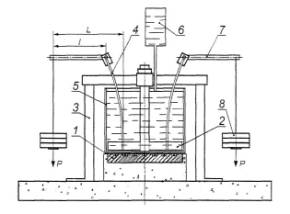 1 - основание; 2 - упорная планка; 3 - подвижный П-образный захват; 4 - неподвижный зажим; 5 - внутренний цилиндр растягивающего механизма; 6 - наружный цилиндр растягивающего механизма; 7 - зажимные винты Рисунок 8 - Схема прибора для определения трещиностойкости покрытия 11.1.3.2 Для наблюдения за раскрытием трещин в бетонном образце и состоянием покрытия применяют оптический микроскоп типа МПБ. 11.1.4 Проведение определения 11.1.4.1 До начала определения подвижный захват прибора 3 перемещают к неподвижному захвату 4 до упора. Ослабив зажимной винт 7 вращением наружного цилиндра 6, нулевую отметку шкалы совмещают со шкалой на внутреннем цилиндре 5. 11.1.4.2 Испытуемый образец вставляют в прибор, после чего, ослабив зажимной винт, вращают наружный цилиндр 6 растягивающего механизма до ликвидации зазора между образцом и губками захватов и появления трещины в бетоне под покрытием. Далее вращают наружный цилиндр растягивающего механизма 6 до нарушения целостности покрытия. Скорость перемещения подвижного зажима должна быть (20 ± 5) мм/мин. Трещиностойкость покрытия определяют по сумме показаний внутреннего 5 (целое число миллиметров) и наружного 6 (сотые доли миллиметра) цилиндров. 11.1.4.3 Состояние покрытия над трещиной в процессе ее раскрытия оценивают по сплошности пленки при помощи оптического микроскопа типа МПБ. С момента образования трещин на неокрашенных краях образца измеряют ширину трещин на поверхности бетона и описывают изменение состояния покрытия при раскрытии их через каждые 0,01 мм до начала нарушения целостности покрытия. 11.1.5 Обработка результатов определения 11.1.5.1 За значение трещиностойкости покрытия на бетоне принимают ширину раскрытия трещин в бетоне, мм, предшествующую появлению признаков разрушения покрытия. 11.1.5.2 За результат определения трещиностойкости принимают среднее значение минимальных значений раскрытия трещин в бетоне, измеренных на каждом из образцов. 11.1.5.3 Статистическую оценку результатов испытаний проводят по ГОСТ 8.207. 11.1.6 Протокол определения 11.1.6.1 Результаты определения оформляют протоколом, в котором указывают: - маркировку и размер образцов; - характеристики исследуемого материала покрытия (название, марку, обозначение стандарта или технических условий на материал и дату изготовления); - технологию и условия нанесения защитного покрытия (температуру, относительную влажность воздуха, продолжительность сушки); - дату и место проведения испытаний; - результаты испытаний для отдельных образцов и серии образцов. 11.2 Метод определения водонепроницаемости бетона с покрытиями11.2.1 Сущность метода 11.2.1.1 Метод определения заключается в оценке водонепроницаемости бетона с покрытием путем ступенчатого повышения давления воды на образец со стороны покрытия (прямое давление воды) или со стороны торца без защиты (обратное давление воды) и выдержки до момента появления мокрого пятна на противоположной стороне образца. Метод определения водонепроницаемости бетона с покрытием по мокрому пятну проводят в соответствии с ГОСТ 12730.5. 11.2.2 Образцы 11.2.2.1 Для проведения определения изготавливают образцы из бетонной смеси с системой покрытия и без покрытия. 11.2.2.2 Определение проводят на шести образцах с одной системой покрытия (основные) и шести образцах без покрытия (контрольные). 11.2.2.3 Состав бетонной смеси и условия тверд