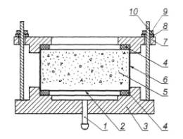Образцы изготавливают в цилиндрических формах с внутренним диаметром 150 мм и высотой 150, 100 и 50 мм. 11.2.2.6 В течение 28 сут образцы твердеют в камере влажного хранения при относительной влажности не менее 90 % и температуре воздуха (20 ± 5) °С. Перед испытанием незащищенные (контрольные) образцы выдерживают в помещении лаборатории в течение суток. 11.2.2.7 Перед нанесением системы покрытия поверхность образцов должна быть ровной, очищена от цементного молока и обеспылена. Содержание влаги в поверхностном слое бетона и температурные условия в процессе нанесения и твердения покрытия определяют согласно требованиям нормативных документов на систему покрытия. 11.2.2.8 На нижнюю поверхность образцов наносят систему защитного покрытия. Вид покрытия и грунта, число слоев, толщину, технологию нанесения, продолжительность и условия твердения покрытия определяют согласно требованиям нормативных документов и проектного решения на систему покрытия. 11.2.2.9 Диаметр открытых торцевых поверхностей образцов - не менее 130 мм. 11.2.2.10 Испытуемые образцы с системой покрытия выдерживают в помещении с температурой воздуха (20 ± 5) °С и относительной влажностью (65 ± 5) % в течение срока, предусмотренного нормативными документами на материал покрытия. 11.2.3 Аппаратура и материалы Для проведения испытаний применяют установку любой конструкции, которая имеет не менее шести гнезд для крепления образцов и обеспечивает возможность подачи воды к нижней или верхней торцевой поверхности образцов при возрастающем ее давлении, а также возможность наблюдения за состоянием верхней торцевой поверхности образцов. 11.2.4 Проведение определения 11.2.4.1 Испытуемые образцы устанавливают в гнезда установки для испытаний и надежно закрепляют. Схема крепления образцов приведена на рисунке 9.