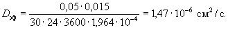 где δ - толщина покрытия, см; τ - продолжительность испытаний в газовой среде, с; С - концентрация углекислого газа в газовой среде, г/см3. Пример - За 30 сут. в газовой среде испытуемые образцы поглотили 0,05 г углекислого газа в расчете на 1 см2 поверхности. Концентрация углекислого газа - 10 % по объему, что составляет 1,964·10-4 г/см3. Толщина защитного покрытия - 150 мкм или 0,015 см. По формуле (23) рассчитывают значение эффективного коэффициента диффузии углекислого газа в защитном покрытии Dэф: