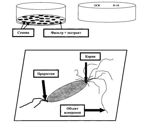 3. Принцип метода«Фитотест» основан на способности семян адекватно реагировать на экзогенное химическое воздействие путем изменения интенсивности прорастания корней, что позволяет длину последних принять за показатель тест-функции. Критерием вредного действия считается ингибирование роста корней семян. Принцип оценки степени опасности и уровня безвредности отхода базируется на экспериментально установленной зависимости величины фитотоксического эффекта от разведения водного экстракта в соответствии с уравнением прямой общего вида: y = mx + b. Учитывая прямолинейный характер данной зависимости, принимая за «x» величину фотоэффекта, а за «y» логарифм разведения экстракта, определение параметров фитотоксичности (LimR и ER50) осуществляется с использованием регрессионной модели: LgR = -mET + b, где ET - фитоэффект, установленный в эксперименте; R - разведение экстракта отхода; m - коэффициент, соответствующий каждому значению фитоэффекта; b - коэффициент регрессии*. * Коэффициенты уравнения m и b рассчитываются для каждого отхода индивидуально по данным эксперимента. Опасность отхода в отношении фитотоксической активности оценивается по показателю ER50. 4. Тест-объектНастоящая методика рекомендует проводить фитотестирование отходов, используя в качестве модельного тест-растения семена овса, которые по итогам предварительных исследований по эколого-гигиенической оценке отходов производства и потребления различного химического состава давали наиболее стабильные и воспроизводимые данные по сравнению с семенами других культур (горох, огурцы, пшеница, морковь и др.). В эксперимент отбираются неповрежденные (недеформированные) семена овса, всхожесть которых составляет не менее 95 %. 5. Способ воздействия отхода на тест-объектФитотоксичность отхода оценивается по биологическому действию его водного экстракта. Исходя из принципа экстремальности, исследования проводятся в условиях прямого контакта тест-растения с экстрактом отхода или его разведениями. А именно, проращивание семян осуществляется в чашках Петри с фильтровальной бумагой, куда вносится водный экстракт исследуемого отхода. Данный способ воздействия является наиболее удобным и простым в техническом отношении. 6. Материалы и оборудованиеШутель - аппарат для встряхивания. Термостат на 20-23°С. Термостат для стерилизации чашек Петри. Весы для навески отхода. Колбы для приготовления экстрактов на ≥ 100 мл (в зависимости от необходимого объема экстракта). Колбочки с притертыми пробками для рабочих растворов. Чашки Петри. Фильтровальная бумага для проращивания семян. Пипетки на 5 мл. Стеклянные палочки с загнутым концом. Пинцет для извлечения проросших семян. Линейка для измерения длины корней проростков. 7. Подготовка образца отхода для исследования7.1. Модельной средой (экстрагентом) для экстракции химических веществ из отходов является дистиллированная вода с начальным уровнем рН = 6,1-6,3. 7.2. Оптимальное соотношение фаз «отход/экстрагент» 1:10. Исходя из этого, навеску отхода 10 г помещают в мерную колбу объемом 100 мл и дистиллированной водой доводят до метки. 7.3. После интенсивного размешивания колбы с экстрактом отхода отстаиваются при комнатной температуре в течение суток. Затем подвергаются 2-часовому встряхиванию на аппарате «Шутель» и фильтрованию через фильтр «синяя лен