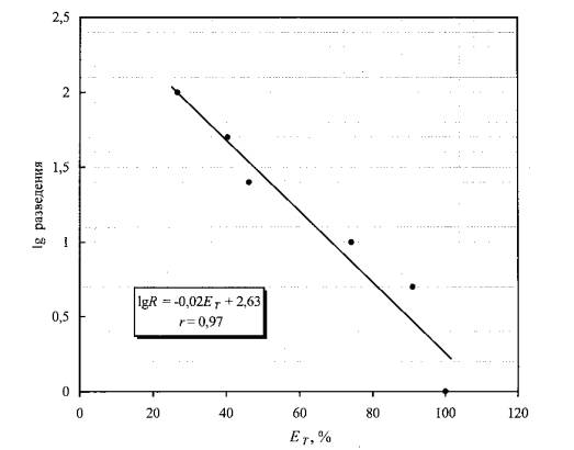 Рис. 3. Зависимость lgR = f(ЕT) по влиянию отхода автозавода на семена растений (маркерами помечены экспериментальные данные) Напомним, что LimR - это разведение, вызывающее фитоэффект на уровне 20 %, a ER50 - разведение, при котором фитоэффект равен 50 %. Подставляем указанные значения фитоэффектов в полученное уравнение (lgR = -0,024 ЕT + 2,63) и вычисляем пороговое (1) и среднеэффективное разведения (2):