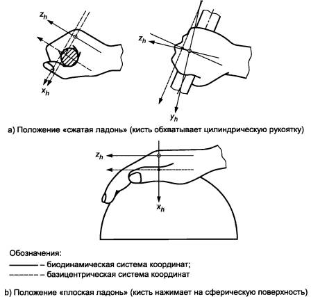 Рисунок 1 - Система координат, связанная с кистью руки Из практических соображений эту систему координат удобно задавать относительно соответствующей базицентрической системы координат (см. рисунок 1). В случае измерения локальной вибрации положение базицентрической системы координат определяется предметом - обрабатываемой деталью, рукояткой инструмента или рычагом устройства управления, - через который вибрация передается на сжатую кисть1) (см. также [1]). 1) Центром биодинамической системы координат является головка третьей пястной кости. Ось zh определена как продольная ось третьей пястной кости с положительным направлением в сторону кончика пальца. Ось хh проходит через начало координат, перпендикулярна к оси zh и направлена вверх, когда кисть находится в нормальном анатомическом положении (ладонью вверх). Ось yh перпендикулярна к двум другим осям и положительно направлена в сторону большого пальца. На практике обычно используют базицентрическую систему координат, получаемую вращением системы координат в плоскости (у - z) таким образом, чтобы ось yh была параллельна оси предмета, удерживаемого кистью руки (например, рукоятки). Желательно измерять вибрацию во всех трех направлениях одновременно. Допустимо проведение измерений вдоль каждой оси по очереди при условии, что рабочие условия от измерения к измерению остаются неизменными. Измерения следует проводить на вибрирующей поверхности по возможности ближе к центру области обхвата рукой машины, инструмента или обрабатываемой детали. Местоположение датчиков должно быть зафиксировано. Примечание - В зависимости от местоположения точки измерения на вибрирующей поверхности уровень вибрации может изменяться весьма существенно. Более подробное руководство по расположению датчиков дано в ГОСТ 31192.2. 5.2.4 Крепление датчиков Крепление датчиков должно быть жестким. Более подробные требования к креплению акселерометра приведены в ГОСТ ИСО 5348 и ГОСТ 31192.2. Практическое руководство по креплению датчиков в сложных ситуациях (например, в случаях упругой вибрирующей поверхности или вибрации импульсного вида), а также по использованию адаптеров дано в ГОСТ 31192.2. 5.3 Контакт руки с источником вибрации Измеренное значение вибрации зависит от способа приложения усилия к вибрирующей поверхности2). Измерения вибрации следует проводить при таких усилиях обхвата, которые характерны для контакта руки с вибрирующей поверхностью машины, рукоятки или обрабатываемой детали в типичных условиях применения инструмента или для типичного технологического процесса. 2) Другим, не менее важным, фактором является то, что от характера приложения усилия зависит влияние вибрации на здоровье оператора. Это влияние может быть разным в зависимости от того, например, удерживается инструмент локальным усилием мышц или это усилие распределено по всей руке. Однако влияние данного фактора на оценку вибрации изучено еще недостаточно и в настоящем стандарте не рассмотрено. По возможности, рекомендуется измерять и фиксировать силу, с которой рука действует на область контакта с вибрирующей поверхностью. Рекомендуется также дать описание позы оператора для конкретных условий измерения или для данного рабочего процесса (см. приложения D и F). Основной величиной, используемой для описания уровня вибрации, я