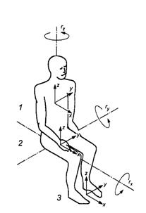 1 - спинка сиденья; 2 - подушка сиденья; 3 - опора для ног Рисунок 1 - Базицентрическая система координат для тела человека 4 Особенности вибрации на рельсовом транспорте4.1 Основные причины появления и усиления вибрации 4.1.1 Рельсовый путь Причиной вибрации могут быть особенности геометрии и конструкции рельсового пути. К ним относятся: - изменения уровня пути (в направлении z), его прямолинейности (в направлении у) или ширины колеи; - дефекты сварки или механической обработки рельсов; - рельсовые стыки; - стрелки; - изменение жесткости пути в вертикальном направлении (например, на мостах); - пересечения с автомобильными путями; - закругления пути и подъемы на виражах, которые могут служить причиной низкочастотной вибрации. 4.1.2 Контакт колеса с рельсом Источник возбуждения рельсового транспортного средства локализован в области контакта колеса с рельсом. Силы, действующие в области этого контакта, являются нелинейными функциями перемещения и скорости и служат причиной вибрации транспортного средства. 4.1.3 Транспортное средство Корпус вагона представляет собой сложную упругую конструкцию, собственные частоты которой могут играть важную роль в усилении вибрации. Поведение этой конструкции зависит от нагрузки, относительного положения тележек, применяемых элементов подвески (пружины, демпферы и т.д.), взаимодействия с другими вагонами в составе данного поезда. Дефекты на беговой поверхности колеса (например, выбоины), а также наличие у него дисбаланса или эксцентриситета являются источниками периодической вибрации, амплитуда и частота которой зависят от скорости движения. Источником вибрации, преимущественно периодического характера, могут быть также машины вращательного действия (например, компрессоры, дизельные двигатели и оборудование для кондиционирования воздуха), устанавливаемые на транспортном средстве. Кроме того, в процессе разгона и торможения такие машины способны создавать переходные колебания. Другой причиной появления переходных процессов может быть нелинейность некоторых элементов конструкции (например, специальных демпферов, буферов, ограничителей поперечных колебаний). Сиденье транспортного средства способно усиливать вибрацию, причем в ряде случаев, особенно на резонансных частотах, такое усиление будет существенно нелинейным. Отклик сиденья, среди прочего, зависит от способа его крепления, массы и положения сидящего в нем человека, а также от формы сиденья и материала, из которого оно изготовлено. Вибрация на рельсовом транспорте имеет следующие особенности: - случайный нестационарный характер (может включать в себя периодические составляющие и охватывать широкий диапазон частот) и относительно невысокий уровень передаваемой внутрь транспортного средства энергии; - отчетливо выраженные резонансы (например, резонанс вторичной подвески вагона вблизи 1 Гц; изгибные колебания вагона с собственной частотой между 8 и 15 Гц). Вибрация может иметь постоянный характер (например, вследствие неоднородностей пути), быть кратковременной (например, связанная с работой оборудования для кондиционирования воздуха) и нерегулярной (например, обусловленная пересечением стрелок или автомобильных дорог). Полное описание ускорения в любой точке транспортного средства требует рассмотрения шести составляющих: тр