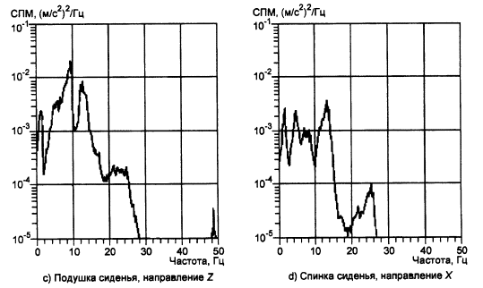 На рисунке А.2 показаны спектральные плотности мощности сигналов вибрации, записанных в точках на подушке и спинке сиденья, после прохождения ими корректирующих фильтров, частотные характеристики которых соответствуют требованиям ГОСТ 31191.1. Для измерений ускорения в вертикальном направлении была использована функция частотной коррекции Wk.
