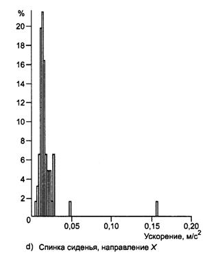 На рисунке А.4 показаны гистограммы распределения среднеквадратичных значений корректированного ускорения (время интегрирования - 5 мин) на подушке и спинке сиденья, полученных с использованием функций частотной коррекции в соответствии с ГОСТ 31191.1. Для измерений ускорения в вертикальном направлении была использована функция частотной коррекции Wk.