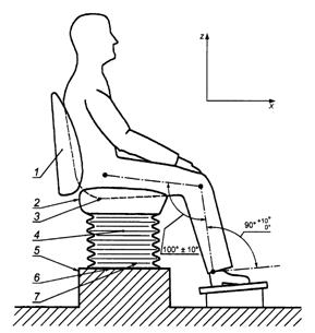 H(fr) - значение передаточной функции на резонансе; СПМ - спектральная плотность мощности; с.к.з. - среднеквадратичное значение; SEAT - коэффициент передачи сиденья; Ts - период выборки. 4 Общие положения4.1 Заданное воздействие вибрации в вертикальном направлении, воспроизводимое лабораторным вибростендом и определяемое через спектральный класс вибрационного воздействия, сформировано в результате анализа данных, полученных в жестких, но типичных рабочих условиях применения машин. Спектр вибрационного воздействия представляет собой огибающую СПМ ускорения, полученных в наихудших (с точки зрения вибрации) условиях эксплуатации машин данного класса. 4.2 Для оценки качества сиденья используют два критерия: - коэффициент передачи сиденья SEAT в соответствии с ГОСТ ИСО 10326-1 (но с применением функции частотной коррекции по ГОСТ 31191.1); - максимальный коэффициент передачи, полученный в результате испытания для определения характеристик демпфирования по ГОСТ ИСО 10326-1. 4.3 Средства измерений должны соответствовать ГОСТ ИСО 8041 и ГОСТ ИСО 10326-1. Функция частотной коррекции должна включать в себя передаточную функцию полосового фильтра и соответствовать ГОСТ 31191.1. 4.4 Меры безопасности при испытаниях - по ГОСТ 31194.1. В процессе испытаний должны быть использованы упругие упоры или другие устройства, применяемые в серийных модификациях испытуемого сиденья с целью ограничить ход подвески. 5 Условия и метод испытаний5.1 Общие положения Общие требования к проведению испытаний - по ГОСТ ИСО 10326-1. На вибростенде, способном воспроизводить вибрацию в вертикальном направлении, устанавливают платформу, размеры которой близки к размерам платформы, служащей опорой сиденью оператора в машине (см. рисунок 1). 5.2 Испытуемое сиденье Испытуемое сиденье должно соответствовать серийно выпускаемым изделиям данной модели по конструкции, статическим и динамическим свойствам и другим характеристикам, которые могут оказать влияние на результат испытаний. До начала испытаний сиденья должны пройти приработку в условиях, указанных изготовителем. При отсутствии таких указаний период приработки должен составить 5000 циклов колебаний с проведением измерений через 1000 циклов. В процессе приработки сиденье нагружают грузом массой 75 кг и регулируют в соответствии с инструкциями изготовителя. Сиденье вместе с подвеской закрепляют на платформе вибростенда, которая в процессе испытаний воспроизводит синусоидальные колебания на частоте, близкой к собственной частоте подвески. Размах перемещения платформы выбирают таким, чтобы вызвать перемещение подвески, составляющее приблизительно 75% ее полного хода. Для этого, как правило, достаточно, чтобы размах перемещения платформы составлял 40% полного хода подвески сиденья. Следует избегать перегрева амортизатора подвески в процессе приработки, для чего, при необходимости, используют принудительное охлаждение амортизатора. Период приработки считают завершенным, если по результатам трех последовательных измерений коэффициент передачи сиденья в вертикальном направлении остается в пределах ±5%. Период между измерениями, в течение которого сиденье подвергают непрерывному воздействию синусоидальной вибрации, должен составлять не менее получаса и включать в себя не менее 1000 периодов колебаний; Сиденье регулируют по массе исп