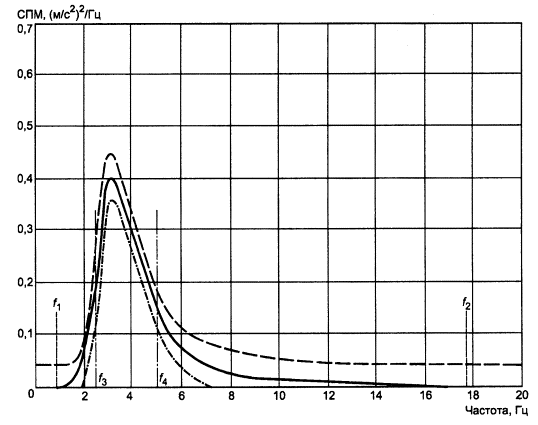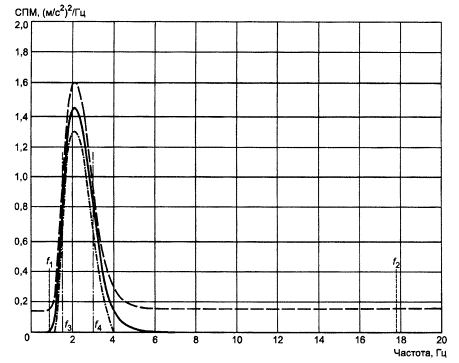 спектральный класс) определен через спектральную плотность мощности, 1) Настоящий стандарт не устанавливает способ получения заданной СПМ и с.к.з. ускорения, относя это к компетенции испытательной лаборатории. Вид СПМ для каждого спектрального класса IТ 1 - IT 4 2) показан на рисунках 2 - 5 соответственно. Уравнения, определяющие вид СПМ ускорения на этих рисунках, приведены в таблице 1. Кривые СПМ, определяемые этими уравнениями, являются заданными характеристиками вибрации, которая должна быть воспроизведена на платформе у основания сиденья в процессе испытаний по 5.5.2. 2) Классы IT 2 и IT 3 используют также для проведения испытаний сидений ковшовых мини-погрузчиков (ЕМ 8) и грейдеров (ЕМ 4) соответственно (см. ГОСТ 27259). Параметры вибрационного воздействия должны быть определены без учета составляющих, лежащих вне диапазона частот (f1, f2).