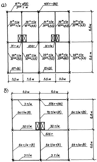 Рис. 9. Унифицированные нагрузки: а - при малом шаге стен жилых этажей; б - при смешанном шаге стен 4.1.5. Перекрытия в уровне пола первого жилого этажа следует принимать типовыми, такими же как для жилой части здания, с сохранением платформенного стыка внутренних стен. Перекрытия над и под первым нежилым этажом должны быть унифицированы и опираться на ригели в поперечном направлении, а ригели должны быть отделены от балок-стенок технического этажа. Это позволяет, в частности, в зданиях с большим и малым шагом конструкцию перекрытия нежилого этажа принимать принципиально одинаковой. 4.1.6. В жилых зданиях с малым шагом поперечных стен при расположении