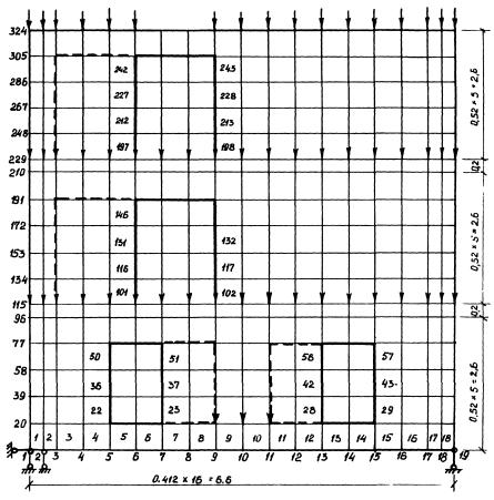 большими проемами. Не допускаются трещины шириной более Запрещается размещать внутреннюю электропроводку в теле панелей внутренних стен нижних нежилых этажей с увеличенными проемами. 3.1.13. В панелях внутренних стен первых этажей с шириной проема 3.1.14. Для стыковки наружных и внутренних стен жилой и встроенной частей здания из разных серий проектов необходима унификация горизонтальных стыков, очертаний граней панелей, конструкций лестничных клеток, привязок стен и других элементов жилой и встроенной части. 3.2. Расчет конструкций3.2.1. Расчет жилых зданий со встроенными нижними нежилыми этажами на действие вертикальной и горизонтальной (ветровой) нагрузок допускается вести независимо. В первом приближении усилия в конструкциях здания высотой до 12 этажей от действия горизонтальной нагрузки и их распределение между столбами и диафрагмами рекомендуется определять как для регулярной системы без учета изменения положения и размеров проемов в стенах нижних этажей по сравнению с их положением и размерами в типовых этажах. После определения усилий от действия горизонтальной нагрузки каждую из вертикальных диафрагм рекомендуется рассчитывать с учетом реальной схемы и расположения проемов на нагрузки, полученные из первоначального расчета. При расчете рекомендуется учитывать, что для зданий высотой 10 этажей и менее, как правило, усилия от ветровых нагрузок не являются определяющими для назначения бетонных сечений конструкций и их армирования. Поэтому компоновку несущей системы таких зданий со встроенными нежилыми помещениями допускается выполнять исходя из расчета на вертикальные нагрузки. 3.2.2. Расчет диафрагм, в первых нежилых этажах которых положение и размеры проемов не изменены по сравнению с типовыми этажами, следует производить аналогичную расчету стен обычных крупнопанельных зданий [3]. 3.2.3. Несущую систему вертикальных конструкций нижних нежилых этажей с увеличенными проемами рекомендуется рассчитывать в стадии эксплуатации на действие вертикальной нагрузки совместно с опирающимися на них конструкциями стен верхних этажей, т.е. в виде диафрагм. При расчете допускается из несущей диафрагмы выделять фрагмент, состоящий из конструкции подвала, техподполья, первого нежилого этажа с увеличенными проемами, технического этажа и типового жилого этажа либо (при отсутствии технического этажа) из двух типовых этажей. По верху фрагмента должна быть приложена полезная нагрузка и нагрузка от веса конструкций всех вышерасположенных этажей, а в уровне перекрытий всех нижележащих этажей - нагрузка, действующая на перекрытие одного этажа. В расчетной схеме на диафрагму должны быть наложены все связи, соответствующие реальным закреплениям фрагмента в здании. 3.2.4. Выбранный фрагмент диафрагмы рекомендуется рассчитывать как составную балку-стенку с использованием метода конечного элемента (МКЭ). На начальном этапе проектирования расчет допускается выполнять в упругой стадии. При разработке расчетной схемы (рис. 3) МКЭ рекомендуется: модель разбивать на прямоугольные элементы таким образом, чтобы размеры простенков и перемычек были кратны размерам сетки: при арочных проемах дуги окружности заменять прямыми и вводить в углах треугольные плоские элементы; платформенный стык моделировать в виде прямоугольных элемент