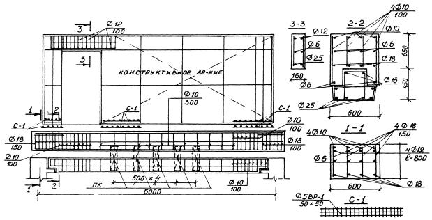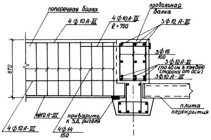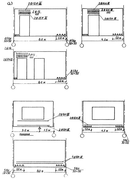 Рис. 17. Узел пересечения главной и второстепенной балок для малого шага колонн 4.3.16. Пример армирования главной балки-стенки при смешанном шаге колонн для решения по п. 4.1.13 показан на рис. 18. 4.3.17. Внутренние и наружные стены первого жилого этажа в зданиях без технического этажа должны проверяться расчетом и могут иметь усиленное армирование перемычек и опорных зон (рис. 19). 5. ТЕХНИКО-ЭКОНОМИЧЕСКАЯ ОЦЕНКА ИНДУСТРИАЛЬНЫХ КОНСТРУКЦИЙ ПЕРВЫХ НЕЖИЛЫХ ЭТАЖЕЙ5.1. Сравниваемые варианты встроенных и отдельно стоящих объектов культурно-бытового назначения должны приводиться в сопоставимый вид по назначению, объемно-планировочным и конструктивным решениям.