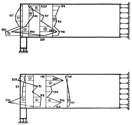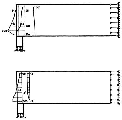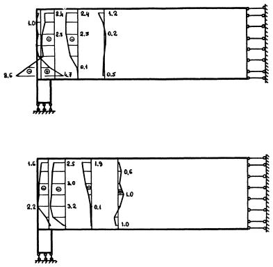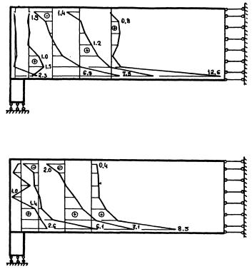 ригеля незначительны и при нормативной нагрузке равны в первом варианте Wy = - величины раскрытия трещин при нормативных нагрузках в обоих случаях не превышают допустимых - постановка горизонтальной арматуры в опорных зонах ригеля повышает его несущую способность и трещиностойкость, так как арматура воспринимает Пуассоново расширение, возникающее от сжатия бетона, и частично горизонтальную нагрузку; - характер распределения напряжений σsx подтверждает эффективность переменного по высоте горизонтального армирования опорных зон ригеля; Рис. П. 10. Эпюры напряжений σsу в вертикальной арматуре (хомутах) на шаге перед разрушением (N = 4,44 МН и Т = 1,11 МН) - рациональность сквозной горизонтальной арматуры подтверждается тем, что напряжения в ней на шаге перед разрушением близки к пределу текучести: в первом варианте в нижней, а во втором (при совместном действии N и T) - в верхней горизонтальной арматуре; наличие силы Т меняет характер работы вертикальных сечений балки; - постановка вертикальной арматуры малоэффективна, она должна назначаться по конструктивным соображениям; - косвенное армирование зон опирания ригеля на колонну обязательно и должно назначаться по результатам расчета. Рис. П. 11 .Эпюры нормальных напряжений σу на шаге перед разрушением (N = 4,44 МН и Т = 1,11 МН) Для выявления