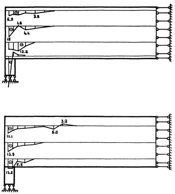 перемещения (прогибы) ригеля были равны: при нормативной нагрузке Wy = Незначительная величина перемещений обусловлена характером нагружения: нагрузка концентрируется по краям. Первые трещины появились у зон опирания ригеля на колонны при нагрузке N = 1,782 МН. Рис. П. 2. Ригель: а - расчетная схема; б - армирование Рис. П. 3. Схема трещинообразования и разрушения ригеля