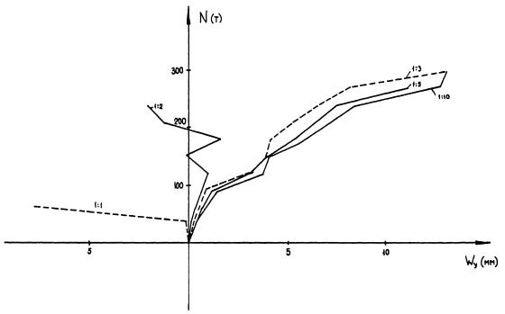 при Т/N = 1/20 Wy = Рис. П. 12. Эпюры нормальных напряжений σх на шаге перед разрушением (N = 4,44 МН и Т = 1,11 МН) Наличие горизонтальной растягивающей силы при Т/N ≤ 1/4 повышает несущую способность конструкции (рис. П.15). Разрушение при этом происходит либо по опорной зоне ригеля (сжатие бетона), либо по вертикальному сечению приопорной зоны. При дальнейшем увеличении соотношения Т/N разрушение происходит от разрыва бетона и арматуры под действием горизонтальной нагрузки по вертикальному сечению. Рис. П. 13. Эпюры касательных напряжений τху нa шаге перед разрушением (N = 4,44 МН и Т = 1,11 МН) Рис. П. 14. Графики максимальных прогибов для различных соотношений Т/Ц Рис. П. 15. Кривая прочности ригеля Литература2. Индустриальные конструкции первых нежилых этажей бескаркасных жилых зданий // Обзор. - М., 1988. 3. Пособие по проектированию жилых зданий (к СНиП 2.08.01-85 «Жилые здания»). - М., Стройиздат, 1989.