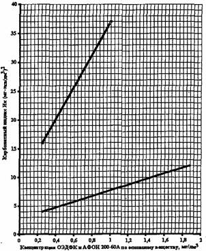 где V - объем воды в системе, м3, n - кратность избытка реагента, величина n может быть оценена следующим образом: для систем впервые пускаемых в эксплуатацию n = 1, для систем находившихся в эксплуатации не менее двух лет допускается увеличение "n" до 2. 5. РЕКОМЕНДАЦИИ ПО РЕЖИМУ ОБРАБОТКИ ВОДЫ ОБОРОТНЫХ СИСТЕМ ОХЛАЖДЕНИЯ5.1. Рекомендации по выбору и ведению режима5.1.1. При обработке воды антинакипином рекомендуется наладить режим подпитки и продувки циркуляционной системы, исключающий резкие изменения расхода продувочной воды, что упростит поддержание заданной концентрации реагента. Если невозможно обеспечить равномерную продувку, дозировку антинакипина рекомендуется рассчитать с учетом максимально возможного коэффициента упаривания для гарантии безнакипного режима. 5.1.2. Для оценки области применения различных фосфонатов может быть использован график на рис. 8, где показана зависимость между карбонатным индексом в циркуляционной воде и необходимой концентрацией ОЭДФК (АФОН 200-60А) или ИОМС-1 по основному веществу, полученная на основании данных промышленного использовании этих реагентов. Верхняя половина области на рис. 8 между кривыми 1 и 2 относится к режимам систем оборотного охлаждения электростанций. Для систем оборотного охлаждения других предприятий, где температура воды может быть существенно больше 50 °С более приемлема нижняя половина области на рис. 8 между кривыми 2 и 3. Реагенты АФОН 230-23А и ПАФ-13А также могут применяться для систем оборотного охлаждения. В связи с ограниченным промышленным опытом применения реагентов АФОН 230-23А и ПАФ-13А для систем оборотного охлаждения области применения указанных реагентов не приводятся. 5.1.3. Выбор концентрации антинакипина в циркуляционной воде для конкретного объекта проводятся специализированной организацией по результатам экспериментов с учетом реальной температуры нагрева воды и т.д. в соответствии с рекомендациями раздела 9.