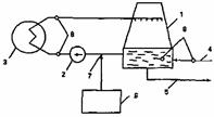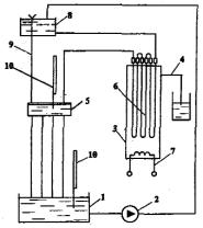 1 – бак; 2 – насос; 3 – теплообменник; 4 – бачок постоянного уровня; 5 – разбрызгивающее устройство; 6 – опытные трубки; 7 – нагреватель; 8 – гидрозатвор; 9 – перелив; 10 – термометр. Рис. 14. Принципиальная схема стенда для исследования накипеобразования в условиях оборотной системы водоснабжения. 9.3.4.1. Стенд практически полностью