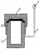 1 – тело автоклава; 2 – крышка автоклава; 3 – прокладка из высокотемпературной резины или фторопласта; 4 – манометр; 5 – трубка к манометру Рис. 12. Автоклав для испытаний с контролем по давлению 9.3.3.4.1. Для более надежной передачи усилия при закручивании крышки автоклава, часть тела автоклава и крышка могут выполняться в виде шестигранника. 9.3.3.4.2. Нагрев автоклава производится в масляной бане (рис. 13). 9.3.3.4.3. В качестве жидкости в бане может быть использована силиконовая жидкость "ПМС марки 100" по ГОСТ 13032-77.