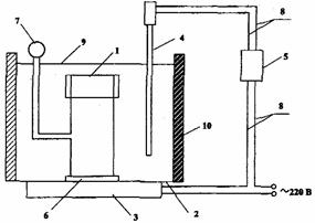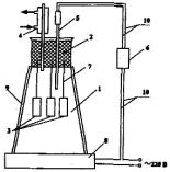1 – стеклянная колба; 2 – резиновая пробка; 3 – образцы; 4 – обратный холодильник; 5 – контактный термометр; 6 – реле; 7 – подвеска из неэлектропроводного материала; 8 – электрическая плитка с магнитной мешалкой; 9 – съемная асбестовая изоляция; 10 – электрические провода Рис. 16. Принципиальная схема установки для коррозионных измерений. 10.2.5. Используемые в испытаниях стальные образцы должны быть отшлифованы, обезжирены и взвешены на аналитических весах с точностью 0,1 мг. 10.2.6. По окончании испытаний образцы должны быть очищены от продуктов коррозии мягкой резинкой, деревянным скребком или фарфоровым шпателем. В случае неполного удаления коррозионных отложений механическим методом их следует растворять в 5%-ном растворе соляной кислоты, содержащей 3 г/дм3 уротропина или тиомочевины. Протравленные образцы очистить мягкой резинкой, промыть 3%-ным раствором соды, водой и высушить. В случае применения химического метода очистки образцов произвести "холостое" травление неиспользованным в испытаниях образцов для определения величины поправки на травление. Очищенные от коррозионных отложений образцы взвешивают на аналитических весах с точностью до 0,1 мг. 10.3. Рекомендации по методу оценки результатов испытаний.Антикоррозионные свойства фосфонатов оцениваются в соответствии с ГОСТ 9.502-82. Защитная способность ингибитора коррозии (Z, %) вычисляется по формуле;