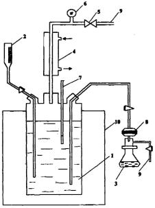 1 – термостатированная емкость; 2 – промежуточная емкость для ввода реагентов; 3 – пробоотборник; 4 – обратный холодильник; 5 – регулирующий вентиль; 6 – вакуумметр; 7 – термометр; 8 – фильтр; 9 – трубка к вакуум-насосу (или эжектору); 10 – термостат Рис. 15. Принципиальная схема установки с термостатом. 9.3.5.1. Перед началом испытаний термостатированную емкость (1) заполняют имитатом исследуемого раствора, не содержащим щелочного компонента. После выхода на заданную температуру включается вакуумный насос или водоструйный эжектор для создания в емкости разрежения, соответствующего температуре насыщения. В ту же емкость вводится раствор, содержащий щелочные компоненты и фосфонат. Кипение воды в течение испытаний обеспечивается поддержанием вакуума, соответствующего заданной температуре. 9.3.5.2. Эффективность антинакипинов оценивается в соответствии с п.п. 9.2.3.2.2.-9.2.3.2.2.5. по результатам анализа отфильтрованных проб раствора. 9.3.6. При проектировании мощной ДОУ или испарительной установки целесообразно проводить эксперименты по отработке режимов на маломасштабных моделях. 10. РЕКОМЕНДАЦИИ ПО ЭКСПЕРИМЕНТАЛЬНОЙ ОЦЕНКЕ АНТИКОРРОЗИОННЫХ ХАРАКТЕРИСТИК ФОСФОНАТОВ10.1. Основные положения10.1.1. Определение марки и оптимальной концентрации фосфоната, используемого в качестве ингибитора коррозии, производиться специализированной организацией с помощью лабораторных испытаний. 10.1.2. Оптимальная концентрация ингибитора коррозии определяется коррозионными свойствами воды, зависящими от концентрации сульфатов и хлоридов, концентрации растворенного кислорода, значения рН, электропроводности и температуры нагрева воды. 10.1.3. Испытания рекомендуется проводить с соблюдением следующих условий. 10.1.3.1. В реальной воде, которая будет использована на конкретном объекте внедрения ингибитора, коррозия, значение pH воды и концентрация в ней растворенного кислорода должны быть такими же, как в реальной системе. 10.1.3.2. Испытания ингибиторов коррозии для систем оборотного охлаждения и ГВС проводятся при максимальной температуре работы оборудования (см. п. 9.1.5.2.); испытания ингибиторов для систем теплоснабжения и паровых котлов низкого давления проводятся при температуре 90-95 °С. Для выпарных аппаратов испытания проводятся при температуре 90-95 °С и начальной минерализации рассола, а также при максимальной минерализации рассола и температуре, соответствующей этому составу рассола. 10.2. Рекомендации по методике проведения испытания.10.2.1. Испытания состоят в выдерживании образцов из углеродистой стали в воде, содержащей ингибитор коррозии, а также в воде без добавок ингибитора, при заданной температуре в течение определенного времени (4-5 часов). 10.2.2. В том случае, если в воде конкретного объекта, используемой в испытаниях, в процессе транспортировки воды снизилось значение pH, повышение значения pH воды до уровня, имеющегося в реальной системе, достигается продувкой через воду перед началом испытаний аргона или азота. 10.2.3. Для моделирования условий эксплуатации систем теплоснабжения и паровых котлов низкого давления перед началом и во время испытаний проводится деаэрация воды путем продувки аргона через нагретую до требуемой температуры воду. 10.2.4. Коррозионные испытания фосфонатов проводятся в стеклянных емкостях при постоянном перемешивании воды ма