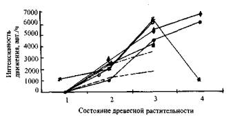Графическая зависимость состояния различных видов древесной растительности от интенсивности транспортного потока представлена на рис. 5. На оси X отложены все состояния деревьев - от фоновых - 1 до крайне неудовлетворительных - 4. Все обследованные деревья, кроме клена ясенелистного, обнаружили прямую зависимость между ухудшением своего состояния и увеличением интенсивности движения транспортного потока. Важно отметить, что ухудшение состояния различных видов древесной растительности не всегда связано с накоплением почвой тяжелых металлов и солей, но почти всегда определяется увеличением интенсивности транспортного потока. Поэтому интенсивность транспортного потока является наиболее значимым фактором для оценки уровня антропогенной нагрузки на придорожную экосистему.