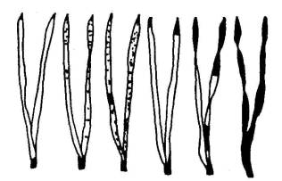 Рис. 6. Классы повреждения (некрозы) и усыхания хвои: повреждения: 1 -хвоинки без пятен; 2-е небольшим числом мелких пятнышек; 3-е большим числом черных и желтых пятен, некоторые из них крупные, во всю ширину хвоинки; усыхание: 1 - нет сухих участков; 2 - кончик 2-5 мм усох; 3 - усохла треть хвоинки; 4 - вся хвоинка желтая или более половины ее длины сухая Состояние придорожных лесополос в целом и их категорию можно определить по классификации, представленной в табл. 14 [2]. Таблица 14
