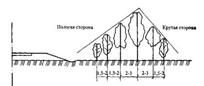 Рис. 8. Схема шумо-, газо-, пылезащитных насаждений: ряды от дороги: 1 - низкий кустарник, 2, 6 - высокий кустарник; 3, 5 - сопутствующая древесная порода; 4 - главная древесная порода В конструкции зеленых насаждений одна или две породы деревьев являются основными, образующими костяк полосы и ее верхний ярус. Остальные дополнительные породы обеспечивают быстрый рост основных пород путем затемнения почвы, образуя нижний ярус. При этом расстояния между деревьями и кустарниками в ряду и между рядами принимаются по табл. 17 [25]. Таблица 17Расстояния между деревьями и кустарниками в ряду и между рядами