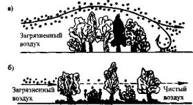 Рис. 9. Удержание пыли защитными лесонасаждениями: а - при загущенной посадке; б – при разреженной посадке Необходимо отметить, что описанный поперечный профиль лесополосы не является единственно правильным. Несколько иная пространственная конфигурация защитных насаждений представлена на рис. 9, где продемонстрирован отрицательный эффект от излишней загущенности посадок, так как в этом случае загрязненный воздух огибает их сверху, образуя завихрения с подветренной стороны [26]. При этом оседает только часть пыли. Напротив, если деревья будут посажены достаточно редко, так, чтобы ветер свободно проходил через них, то его скорость будет настолько снижаться, что осядут частицы диаметром более 40 мкм. Более мелкие частицы будут наталкиваться на листья, иглы и сучья. Последние в свою очередь будут играть роль тканевых фильтров, изменяя направление потоков воздуха и осаждая инертные частицы пыли. Таким образом, в зимний период деревья, лишенные листьев, также выполняют роль фильтра (из общего пылесброса на долю потерявших зеленый покров деревьев зимой приходится 40%, летом - 60%) [26]. Помимо всего перечисленного плотные посадки деревьев ослабляют освещенность нижних этажей зданий, могут отрицательно влиять на безопасность транспортных средств и пешеходов. Пространственная конфигурация защитных насаждений оказывает определенное влияние и на степень снижения шума лесополосой. Максимальное снижение уровня шума дает шахматная посадка деревьев, обеспечивающая фронтальную сомкнутость лесополосы. Улучшить ситуацию помогает создание газонов между полотном дороги и тротуарами, так как они меньше отражают звук, чем асфальтобетон и открытый грунт. При правильной посадке шумозащитная способность деревьев проявляется и зимой за счет сохранения снега на ветвях. Хорошо поглощает шум вертикальное озеленение зданий, которое сокращает поверхность отражения звука, одновременно увеличивая звукопоглощение стен в 6-7 раз. В результате защитная лесная полоса может иметь показатели, приведенные в табл. 18 [24]. Таблица 18Снижение уровня загрязнения среды защитной полосой