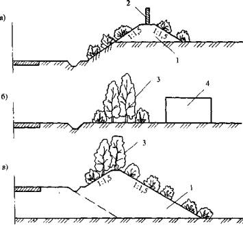Рис. 10. Примеры (а, б, в) комплексного применения защитных сооружений: 1 - земляной вал; 2 - защитный экран; 3 - зеленые насаждения; 4 - нежилые здания и сооружения В настоящее время существует большое количество проектов, сочетающих биологические и инженерные методы защиты придорожной территории. Так, например, бетонно-земляной вал с озеленением предназначен для защиты от шума и других транспортных загрязнений в населенных пунктах. Он выполняет также декоративные функции и способствует озеленению жилых массивов (рис. 11).
