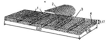 Рис. 3. Схема матрасно-тюфячного арматурного каркаса и его элементов в сборке: 1 - диафрагма; 2 - крышка; 3 - боковая панель; 4 - торцевая панель Расход проволоки для завязки арматурных каркасов коробчатых, матрасно-тюфячных и цилиндрических габионов составляет 3-5% от общей массы этих каркасов. Стандартные размеры и масса арматурных каркасов коробчатых, матрасно-тюфячных и цилиндрических габионов могут быть изменены на месте строительства путем весьма несложных технологических операций в зависимости от конкретных условий применения этих габионов.