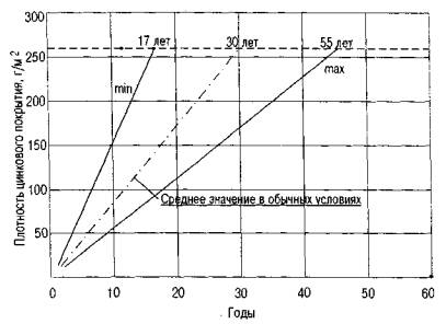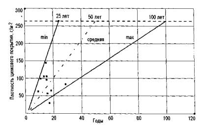 Рис. 5. Зависимость срока службы цинкового покрытия от плотности его оцинкования Лабораторно-экспериментальные испытания показывают [13, 14], что при плотном оцинковании (260 г/м2) срок службы цинкового покрытия составляет 17-55 лет (рис. 6).
