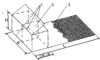 Рис. 8. Конструктивные элементы системы Террамеш: L - длина; В - ширина; Н - высота габиона; 1 - проволока армирования каркаса габиона; 2 - диафрагма; 3 - сетчатая армирующая панель Коробчатые габионы, заполненные камнем, составляют лицевую сторону системы Террамеш. К нижним граням габионов присоединяются горизонтально располагаемые сетчатые армирующие панели. Края панелей укрепляются проволокой диаметром 3,4-4,4 мм, оцинкованной и покрытой ПВХ или гальфаном. Между панелями насыпаются и утрамбовываются слои насыпного грунта, армируемые сеткой. Лицевая сторона системы Террамеш может быть выполнена в виде вертикальной или наклонной стены гладкого или ступенчатого очертания (рис. 9). Эту сторону составляют коробчатые габионы, которые заполняются камнем полностью или с частичным заполнением растительным грунтом в левой верхней части габионов.