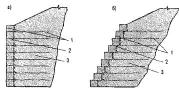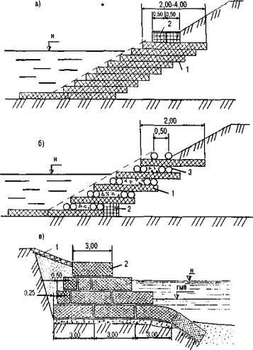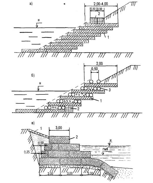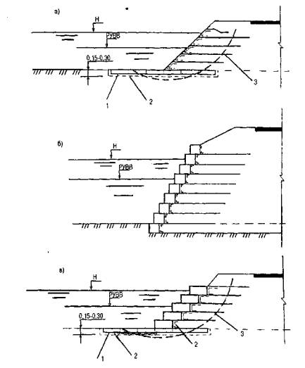 Рис. 27. Схемы откосно-ступенчатых габионных укреплений вдольбереговых сооружений: а - матрасно-тюфячные; б - цилиндрические совместно с матрасно-тюфячными; в - коробчатые совместно с матрасно-тюфячными; 1 - матрасы; 2 – коробчатые габионы; 3 - цилиндрические габионы При относительно небольшой крутизне нижней части берегового откоса и небольшом стеснении поименно-русловых массивов могут быть применены конструкции откосно-матрасного габионного укрепления (см. рис. 26, а) или комбинированные конструкции, состоящие из габионных матрасов и коробчатых габионов, сопрягаемых в откосно-ступенчатую конструкцию (см. рис. 26, б, в). К числу откосно-ступенчатых конструкций относятся конструкции матрасных габионов (см. рис. 27, а) или цилиндрических габионов (см. рис. 27, б), ступенчато укладываемые на пологий береговой откос. Конструкции габионных укреплений (см. рис. 26, б, в и рис. 27, а, б) по сравнению с откосно-матрасным укреплением (см. рис. 26, а) способны выдерживать большие скорости течения воды и волновых воздействий. Наиболее значительные гидрологические воздействия способны выдержать ступенчато располагаемые на береговом откосе конструкции, состоящие из коробчатых габионов больших размеров (см. рис. 27, в). Эти конструкции могут применяться в любых климатических условиях при скоростях течения воды 4-6 м/с. При относительно большой крутизне нижней части берегового откоса и вынужденной необходимости стеснения поименно-русловых массивов могут быть применены габионные конструкции в виде подпорно-защитных стен ступенчатой формы, устраиваемых из коробчатых габионов (см. рис. 28). В случае значительных глубин размывов наиболее предпочтительны конструкции, в нижней части которых предусматривается матрасно-тюфячный габион (см. рис. 28). Подпорно-защитные габионные конструкции должны быть рассчитаны на устойчивость против их опрокидывания. Расчеты устойчивости должны производиться на момент развития наибольшей глубины размыва. По своему функциональному предназначению береговые укрепления являются природно-техногенными фиксирующими границами между руслом и пойменными массивами. Они должны органично вписываться в ландшафт и экологическую среду местности и устойчиво функционировать в период эксплуатации. Конструктивные решения по защите береговых линий не подлежали ранее типизации. Индивидуальные решения по ним не прорабатывались, а методические основы их проектирования отсутствовали.