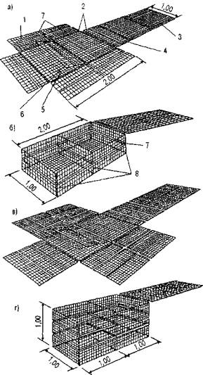 Рис. 14. Коробчатые каркасы габионов: а - стандартный, готовый к сборке; б - стандартный, в собранном виде; в - нестандартный, готовый к сборке; г - нестандартный, в собранном виде; 1 - боковая панель; 2 - спиральная петля; 3 - крышка; 4 - торцевая панель; 5 - панель основания; 6 - перегородка; 7 - двойные стержни усиления; 8 - поливинилхлоридные спиральные петли