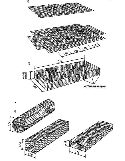 Рис. 1. Типы арматурно-сетчатых каркасов: а - коробчатые; б - матрасно-тюфячные; в - цилиндрические