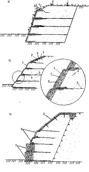 Рис. 17. Схемы укрепления откосов и склонов: а - системой зеленый Террамеш; б - системой зеленый Террамеш с биоматами; в - комбинированная конструкция; 1 - лицевая грань системы зеленый Террамеш, выполненная из стальной сетки двойного кручения с гальфановым покрытием; 2 - кокосовые биоматы; 3 - армирующая панель; 4 - грунт засыпки, уплотненный до 1,6-1,7 т/м3; 5 - колышки; 6 - растительный грунт; 7 - система Террамеш; 8 - система зеленый Террамеш; 9 - защита откоса с помощью биоматов • система зеленый Террамеш, система Террамеш и комбинированные с биоматами конструкции (рис. 17); • сетка Макмат в сочетании с упорными конструкциями в виде цилиндрических или матрасно-тюфячных габионов; • матрасы Геомак, а также их сочетания с сеткой Макмат, матрасно-тюфячными и другими конструкциями Габионов (см. рис. 12). Наиболее целесообразными типами габионных конструкций для использования в сложных условиях проектирования, а также в условиях ограниченных возможностей традиционных защитно-изолирующих, несущих и сопрягаемых друг с другом этих конструкций являются: • системы Террамеш и зеленый Террамеш с использованием дренирующего грунта обратных засыпок и озеленением (см. рис. 17); • матрасно-тюфячные с минимальными стандартными размерами высот, равными 15, 17, 23 см, с заполнением каменными материалами и с коробчатыми конструкциями упоров; • матрасно-тюфячные и коробчатые противофильтрационные с заполнением битумной мастикой или водопроницаемой мембраной (см. рис. 7). Габионные конструкции целесообразны к использованию и находят применение при усилении, стабилизации неподтопляемых насыпей и подпорно-удерживающих сооружений. Конструктивные особенности этих конструкций и сооружений, а также рекомендации по их применению рассматриваются в последующих разделах обзорной информации. 4.2. Откосы подтопляемых сооруженийОткосные подтопляемые конструкции укреплений предназначены для противодействия ударно-сдвигающим усилиям, возникающим в поверхностных слоях грунта откосов земляного полотна, подмостовых конусов, регуляционных сооружений, на входе и выходе из малых водопропускных сооружений от различных видов силовых и размывающих воздействий паводковых и меженных вод, ледохода, лесосплава, карчехода, водных объектов временного и постоянного функционирования, стекания поверхностных и инфильтрационных вод, ветровых и судовых волн. Наибольшими возможностями для применения взамен традиционных несущих биологических укреплений (одерновки сплошной и в клетку, сплошной посадки кустарника, лесопосадки), а также присыпных берм из глинистых грунтов, растительного грунта с полимерной сеткой или геотекстилем и посадкой ивовых черенков, цементогрунтовых решеток с различными видами материалов заполнения ячеек, сплошного цементогрунтового и усиленного пневмо-набрызгного укреплений в средней части подтопляемых сооружений, при отсутствии размывов у подошвы укрепляемого сооружения и при малоопасных проявлениях гидрометеорологических процессов и явлений, обладают следующие конструкции: • система зеленый Террамеш с наклонно-откосной лицевой гранью на основании из матрасно-тюфячных габионов (рис. 18, а); • система Террамеш со ступенчатой лицевой гранью на естественном основании и на матрасных габионах (см. рис. 18, б, в); • матрасно-тюфячные габионы размерами 3×