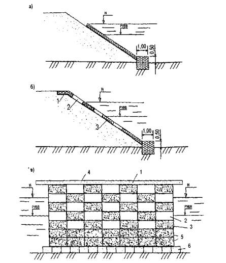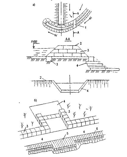 Рис. 20. Схемы возможных габионных укреплений для защиты нижней части подтопляемых откосов от подмыва при наличии меженных вод с применением матрасных, коробчатых и цилиндрических габионов: 1 - коробчатые габионы (1,50×1×1 м); 2 - геотекстиль; 3 - матрасы (h = 0,30 м); 4 - цилиндрические габионы (L = 2,00 м; Ø = 0,30 м); 5 - матрасы (h = 0,23 м) Конструктивные решения, представленные на рис. 20, и аналогичные, им решения, должны прорабатываться индивидуально с учетом наиболее рациональных типов, размеров и областей применения габионных конструкций, неразмывающих скоростей течения, расчетно-прогнозных глубин размывов, необходимых запасов заглубления, технологичности и других условий производства строительных работ, более подробно рассматриваемых в работе [10]. При проектировании габионных и сопрягаемых с ними конструкций в средней и нижней частях подтопляемого сооружения следует учитывать возможное воздействие примерзающего ледяного покрова к откосным сооружениям. Воздействие от примерзшего к откосным конструкциям укреплений ледяного покрова при изменении уровня воды предопределяет необходимость выполнения специальных расчетов. При недостаточной изученности факторов гидрометеорологических воздействий в отдаленных и необжитых районах и отсутствии должной уверенности в надежности вычисленных расчетных гидрометеорологических критериев следует предусматривать более капитальные укрепления, в том числе индивидуальные, или те, которые обладают большими возможностями при относительно одинаковых затратах на их устройство. Постоянному, периодическому и меженному подтоплению способны подвергаться подмостовые конуса, регуляционные сооружения, береговые линии русл, а также автомобильные дороги, расположенные вдоль пойменных массивов и русл. Условия функционирования этих сооружений, как и конструктивные решения по их укреплению, отличаются специфическими особенностями по сравнению с укреплениями откосов подтопляемого земляного полотна. Особенности конструктивных решений по укреплению этих объектов и сооружений более подробно рассматриваются в главе 5 настоящего обзора. 5. УКРЕПЛЕНИЕ ПОДМОСТОВЫХ КОНУСОВ, РУСЛ, РЕГУЛЯЦИОННЫХ И ВПОЛЬБЕРЕГОВЫХ СООРУЖЕНИЙ5.1. Исходные положения проектированияПодмостовые конуса и укрепляемые русла, регуляционные и вдольбереговые сооружения следует рассматривать как наиболее ответственные сооружения, предназначенные для восприятия нагрузок и воздействий паводочных и сопряженных с ними процессов и явлений. От их устойчивости во многом зависит сохранность основных конструктивов мостов и дорожного полотна, а также их надежное функционирование в период эксплуатации. Капитальность этих сооружений и их укреплений должна соответствовать капитальности возводимых и реконструируемых дорожно-мостовых объектов. Капитальность вдольбереговых и регуляционных сооружений, от устойчивости которых зависит надежное функционирование других объектов, а также экологическое равновесие природно-техногенной среды, следует определять индивидуально с учетом уровня (степени) ответственности возводимых (реконструируемых) объектов и сопряженных с ними других объектов. Критерии вероятности превышения максимальных расходов и уровней воды, а также запасы возвышения верха укреплений подтопляемых откосов должны прин
