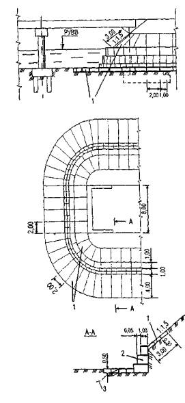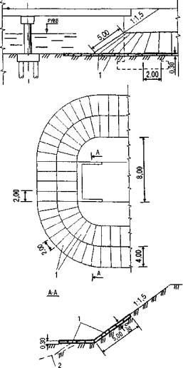 Рис. 22. Схема габионного укрепления подмостовых конусов, свободно размещаемых в пролетах мостов с размываемыми руслами: 1 - матрасы; 2 - линия размыва При небольших пролетах мостов, в которых подмостовые конуса и их укрепления трудно размещаемы, целесообразны конструктивные решения, представленные на рис. 23. В этих решениях подмостовые конуса не совмещены с регуляционными сооружениями. Они позволяют увеличить подмостовое пространство, отодвинуться от воронки местного размыва, возникающей у промежуточной опоры моста, и обеспечить защиту подмостового конуса при достаточности низа укрепления. Подмостовые конуса в этих решениях могут быть в виде плавного (см. рис. 23) или ступенчатого в плане очертания.