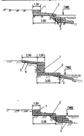 Рис. 29. Схемы возможных габионных укреплений берегов при пологих поверхностях поймы и берегов: 1 - коробчатые габионы; 2 - матрасы; 3 – цилиндрические габионы; 4 - геотекстиль При пологих поверхностях прибрежных пойменных массивов, относительно высоких берегах и значительных глубинах меженных вод могут быть целесообразны габионные конструктивные решения береговых укреплений, представленные на рис. 29. При значительной протяженности и пологости берегов и крутизне прибрежно-пойменных массивов габионные конструктивные решения могут быть устроены по одной из схем этих решений, более подробно рассматриваемых в работах [10, 23]. Габионные укрепления берегов (см. рис. 29) предусматривают компоновочные конструкции, состоящие из матрасов, коробчатых и цилиндрических габионов. Отметки верха габионных стенок, состоящих из коробчатых габионов, должны определяться проектным профилем укрепления по каждому берегу в пределах границ укрепления. Количество рядов цилиндрических габионов должно определяться индивидуально в зависимости от глубины меженных вод. Низовое укрепление у дна русла должно устраиваться с учетом невозможности размывов этого укрепления. 5.5. Регуляционные сооруженияВ практике дорожно-мостового строительства регуляционные сооружения используются как при проектировании вдольбереговых автомобильных дорог, так и при проектировании мостовых переходов. Выбор и назначение оптимальных типов габионных укреплений регуляционных сооружений должны определяться в соответствии со схемами регулирования речных потоков, разновидностями и конструктивными особенностями этих сооружений, а также в соответствии со схемами их компоновки на конкретных объектах мостовых переходов или вдольберегового расположения автомобильных дорог. Габионные укрепления речных откосов и голов регуляционных дамб должны быть сопряжены с габионными конструкциями укреплений подмостовых конусов в виде плавного их совместного очертания. Конструкции габионных укреплений речных откосов и голов регуляционных дамб должны быть решены применительно к конструкциям подмостовых конусов и предусматривать возможность применения: сплошного укрепления откосов матрасами; комбинированных - с применением матрасов и коробчатых габионов; коробчатых - на дамбах небольших радиусов с замкнутым очертанием (грушевидных); комбинированных - с применением матрасов и цилиндрических габионов или сочетаний цилиндрических габионов с другими габионами. Конструкции габионных укреплений откосов внутренних сторон регуляционных сооружений следует назначать в зависимости от условий их подтопления и обтекания речным потоком, а также от других факторов гидрологических воздействий. При разработке конструкций и габионных укреплений шпор (траверс) могут быть применены матрасы, коробчатые габионы, а также их сочетания друг с другом. Рекомендуемые схемы возможных габионных конструкций и укреплений шпор и траверс более подробно отражены в работах [10, 23]. Габионные конструкции и укрепления могут быть применены при устройстве полузапруд и при использовании укрепляемых берм на подходах к мостам. При разработке схем регулирования речных потоков с помощью полузапруд и укрепляемых берм могут быть использованы схемы возможных конструктивных решений, рассматриваемые в рабо