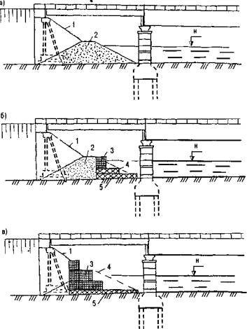 Рис. 30. Схемы конструктивных решений по увеличению водопропускной способности мостов и одновременной защите береговых опор: а - традиционное совмещение подмостовых конусов и регуляционных дамб; б - частичное изменение конструкции и укрепления дамбы; в - коренное изменение конструкции подмостового конуса и дамбы; 1 - подмостовой откос; 2 - регуляционная дамба в подмостовом пространстве; 3 - коробчатые габионы; 4 - контур речного откоса дамбы после изменения ее конструкции; 5 - матрасно-тюфячные габионы Нередко это явление носит угрожающий характер не только возводимым сооружениям, но и пойменным массивам, на которых начинает наблюдаться оврагообразование. Для своевременного учета или устранения последствий этого явления целесообразно устройство противоэрозионного водослива в наиболее низком месте береговой линии. Рекомендуемые схемы возможных габионных конструкций противоэрозионных водосливов, устраиваемых в теле регуляционных дамб и через укрепляемые габионами береговые линии, представлены на рис. 31.