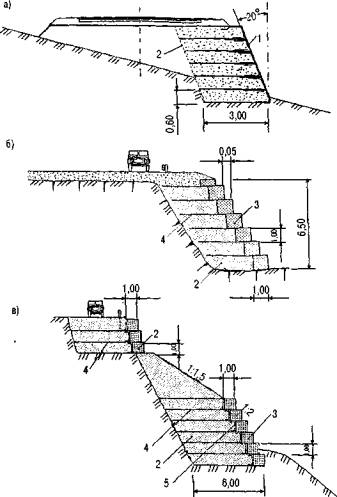 Рис. 31. Противоэрозионные габионные водосливы: а - в теле регуляционных дамб; б - в берегоукрепительных сооружениях; 1 - положение водослива; 2 - верх дамбы; 3 - коробчатые габионы; 4 - матрасы; 5 – цилиндрические габионы 6. ПОДПОРНО-УДЕРЖИВАЮЩИЕ, ЗАЩИТНЫЕ, УСИЛИВАЮЩИЕ, СТАБИЛИЗИРУЮЩИЕ И ПРОТИВОФИЛЬТРАЦИОННЫЕ ГАБИОННЫЕ КОНСТРУКЦИИ И СООРУЖЕНИЯИспользование габионных конструкций позволяет значительно расширить возможности и диапазон инженерных и природоохранных решений по устройству подпорно-защитных, подпорно-удерживающих, усиливающих, стабилизирующих и противофильтрационных сооружений и конструкций. Подпорно-удерживающие и подпорно-защитные габионные конструкции и сооружения могут находить применение в следующих наиболее характерных случаях: • при укреплении откосов земляного полотна и склонов; • при устройстве и укреплении подмостовых конусов, регуляционных и вдольбереговых сооружений; • при устройстве земляного полотна, съездов с транспортных развязок и других дорожных сооружений в стесненных условиях и близкорасположенных подземных коммуникаций; • при усилении и стабилизации эксплуатируемых деформирующихся насыпей, а также укреплении крутых и высоких склонов (откосов); • при устройстве водоотводных, водопропускных, водобойных и очистных сооружений, а также подводящих, отводящих и канализируемых русл. Для устройства подпорно-удерживающих и подпорно-защитных сооружений могут быть использованы: системы Террамеш и зеленый Террамеш; коробчатые габионы; комбинированные системы, выполняемые с использованием сопрягаемых друг с другом коробчатых, цилиндрических и матрасно-тюфячных габионов.