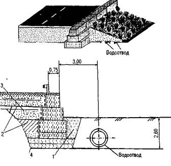 Рис. 33. Схемы возможных устройств габионных конструкций в местах близкого расположения подземных коммуникаций: 1 - засыпка грунтом; 2 - армирующие элементы; 3 - грунт земляного полотна; 4 - геотекстиль В стесненных условиях расположения автомобильных дорог откосные части земляного полотна могут быть заменены на подпорно-удерживающие габионные конструкции, располагаемые с одной или двух сторон автомобильной дороги. Конструктивные решения таких сооружений могут быть приняты с учетом рекомендаций работ [10, 23]. При реконструкции автомобильных дорог и их расположении вблизи подземных коммуникаций откосная часть земляного полотна может быть устроена в виде габионной подпорно-удерживающей стенки применительно к одной из схем, представленных на рис. 33. Необходимость размещения съездов транспортных развязок движения, а также дорог в подмостовых пространствах мостовых сооружений с небольшими пролетами предопределяет в качестве возможных решений применение разновысотных габионных подпорно-удерживающих сооружений. В качестве одного из таких решений может быть использована конструктивная схема, представленная на рис. 34.