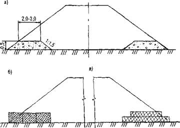 Рис. 35. Подошвенные слои: а - традиционные - из дренирующего грунта под откосами насыпей; б - из коробчатых габионов; в - из матрасно-тюфячных габионов