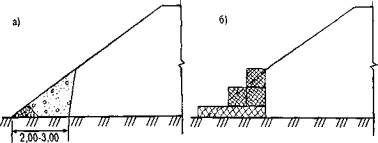 Рис. 36. Дренажные шпоры в откосе: а - традиционные; б- из коробчатых и матрасно-тюфячных габионов