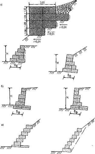 Рис. 37. Дренирование откоса: а - дренирующим грунтом; б - габионными конструкциями Взамен традиционной конструкции, состоящей из подошвенных дрен (с применением перфорированных дренажных трубок), откосной обсыпки дренирующим грунтом (слоем толщиной 50 см) и защитной бермы с откосной засыпкой дренирующего грунта растительным грунтом (слоем 10 см) с засевом трав, целесообразно использовать сплошное покрытие откоса нижней части земляного полотна матрасно-тюфячными габионами. Для усиления и стабилизации эксплуатируемых насыпей автомобильных дорог, а также для устройства земляного полотна с высотой откоса более 8-12 м рекомендуется использование габионных конструкций в виде подпорно-удерживающих и подпорно-защитных стен. Применение габионных подпорно-удерживающих и подпорно-защитных стен для усиления и стабилизации эксплуатируемых насыпей является в ряде случаев более надежным мероприятием, чем традиционная отсыпка контрбанкетов из дренирующего грунта. Устройство таких габионных стен не требует больших объемов дефицитных дренирующих грунтов, отвода дополнительных площадей культурных земель под основания контрбанкетов, сноса строений и переноса существующих коммуникаций. Применение габионных подпорно-удерживающих и подпорно-защитных стен при реконструкции и новом строительстве участков автомобильных дорог с высотой насыпи более 8-12 м является в ряде случаев более экономичным мероприятием, чем устройство бетонных и железобетонных подпорных стен. Являясь альтернативным вариантом по устройству подпорно-удерживающих и подпорно-защитных сооружений, габионные конструкции позволяют расширить диапазон индивидуальных решений, а также восполнить пробел в соответствующих типовых решениях по конструкциям земляного полотна и укреплению его откосов. К рекомендуемым типам габионных стен, используемым в качестве подпорно-удерживающих и подпорно-защитных сооружений, следует прежде всего относить следующие их разновидности (рис. 38): массивно-объемные (гравитационные); полумассивные (полугравитационные); тонкостенные. Габионные стены этих разновидностей принято подразделять на низкие (при Н/Вф < 1,5) и высокие (при Н/Вф > 1,5), где Н - видимая высота стены, м; Вф - эффективная ширина стены, м.