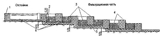 Рис. 39. Схемы возможных габионных укреплений водоотводных канав, резервов и кюветов: 1 - матрасы; 2 - геотекстиль; 3 - коробчатый габион При устройстве комплекса овражно-противоэрозионных сооружений габионные укрепления целесообразны для укрепления откосов оврагов, водозадерживающих валов-террас, водоотводных канав с водосливами, распылителей поверхностного стока, головных овражных водопропускных и других донных сооружений (запруд, донных перепадов, порогов и плотин). Конструкции габионных укреплений всех этих сооружений разнообразны и индивидуальны. Схемы возможных конструктивных решений габионных конструкций и сооружений, предназначенных для целей водоперепуска и водоотведения с учетом работ [27, 28], наиболее полно отражены в обобщающих работах [10, 23, 29]. 7.2. Очистные сооруженияПрактикой современного дорожно-мостового строительства апробировано использование габионных структур и ряда габионных конструктивных решений для очистки поверхностных вод, стекающих с проезжей части автомобильных дорог и мостовых сооружений. Однако этот опыт неоднозначен по эффективности очистки сточных вод и предопределяет необходимость более обоснованного подхода к выбору оптимального типа очистного сооружения и оценки его очистительной способности. Концептуальную основу возможного применения габионных конструкций для очистки сточных вод предопределяют следующие возможности габионных структур: высокая проницаемость воды и воздуха; большая внутренняя поглощаемость мелких частиц твердого стока и нефтепродуктов; долговечность и химическая нейтральность; пригодность для прорастания растений, способных усваивать некоторые загрязняющие компоненты сточных вод. С учетом этих возможностей габионных структур к числу сооружений, применяемых для совместного и комплексного водоотведения и очистки сточных поверхностных вод и возводимых с использованием биоинженерных элементов, сорбентов и габионных конструкций, принято относить: водоотводные и водоподводящие канавы и лотки; сопрягающие сооружения; фильтрующие запруды и дамбы; водоемы-отстойники; фильтрующие накопители; мелководные биоплато и площадки; глубоководные ванны; ступенчатые фильтрационные бассейны с высокоэффективными природными сорбентами. Конструктивные особенности некоторых типов этих сооружений, рекомендации по их эксплуатации и мониторингу отражены в общих чертах в работах [11, 30, 31]. Наиболее подробный анализ этих сооружений и рекомендаций по выбору оптимальных конструкций очистных сооружений дан в работах [10, 23, 29]. При выборе того или другого типа очистных сооружений, возводимых с использованием биоинженерных элементов, сорбентов и габионных конструкций, следует учитывать: фоновые, фактические и прогнозные показатели загрязненности поверхностного стока; очистные способности этих сооружений; конструктивные схемы организации водоотвода на конкретном объекте, водопропускную способность проектируемых сооружений, эксплуатационные преимущества, а также требования природоохранных органов. Эти требования во многом должны соотноситься к выбору и обоснованию габионных сооружений (конструкций), обладающих большими очистными способностями, чем традиционные сооружения (конструкции). К таким сооружениям (конструкциям) следует прежде всего относить укрепле