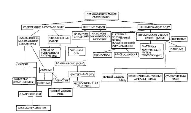 АВТОМОБИЛЬНЫЕ ДОРОГИ Л.А. Горелышева ОРГАНОМИНЕРАЛЬНЫЕ СМЕСИ Обзорная информация 3-2000 В данном выпуске обзорной информации дан анализ всех применяемых в дорожном строительстве горячих и холодных органоминеральных смесей за исключением классического асфальтобетона, приведены принципы проектирования их составов, основные характеристики, методы получения и особенности использования и формирования структуры материалов, а также сравнительный анализ смесей, применяемых в России и за рубежом. Обзор подготовила Выпуск 3 Москва 2000 Выходит с 1971 г. 5 выпусков в год СОДЕРЖАНИЕ 1. ВВЕДЕНИЕАсфальтобетонные покрытия являются преобладающим типом для капитальных дорожных покрытий. В большинстве развитых стран протяженность дорог с таким типом покрытия составляет 90-95% от общей протяженности дорог. Наряду со стандартными асфальтобетонными смесями применяются различные другие составы - дренирующий асфальтобетон, асфальтобетон без минерального порошка, щебень, обработанный органическим вяжущим, называемый черным щебнем. В последнее время все шире используются битумные композиции: такие, как битумные эмульсии, комплексные вяжущие (битумополимерные, битумокаучуковые, с серой или резиной, с добавкой природных битумов и т.д.). Для некоторых видов смесей могут применяться альтернативные виды органических вяжущих - смолы, гудроны, тяжелые нефти и т.д. В этих случаях правильнее называть весь этот класс смесей на органических вяжущих - органоминеральными. Тогда смеси на основе битумов, но с применением нестандартных материалов, представляют собой класс битумоминеральных материалов, а асфальтобетон - это один из видов этого класса и относится к типу органоминеральных смесей. Дорожные одежды из органоминеральных материалов имеют ряд технологических и эксплуатационных преимуществ. Это - ровность, возможность обеспечения требуемой шероховатости поверхности, короткие сроки проведения ремонтных и восстановительных работ, высокая эксплуатационная надежность, возможность использования местных материалов и технологичность. Органоминеральные смеси (ОМС) достаточно широко распространены в дорожном строительстве не только в России, но и за рубежом. Однако до сих пор этот тип смесей не классифицирован, некоторые смеси не имеют точных определений или переводов на русский язык. Обилие видов материалов, применяемых в дорожном строительстве, требует анализа, проведения терминологических определений идентичности названий материалов в русском и зарубежном дорожном производстве. Сведения о свойствах и требованиях к различным видам органоминеральных смесей до сих пор не систематизированы и приводятся в многочисленных разрозненных источниках и нормативных документах. 2. СОВРЕМЕННАЯ КЛАССИФИКАЦИЯ И ОБЛАСТЬ ПРИМЕНЕНИЯ ОРГАНОМИНЕРАЛЬНЫХ СМЕСЕЙ2.1. ВИДЫ ОРГАНОМИНЕРАЛЬНЫХ СМЕСЕЙОрганоминеральной смесью называется смесь минеральных материалов подобранного состава с органическими вяжущими (битумом, гудроном, тяжелыми нефтями, смолами и т.п.). Этот большой класс смесей подразделяется на: • асфальтобетонные; • органоминеральные. Каждый из этих видов смесей в свою очередь делится на горячие, приготавливаемые и применяемые в горячем состоянии при температуре 100°С и более, и холодные - приготавливаемые и применяемые при температуре менее 100°С. 