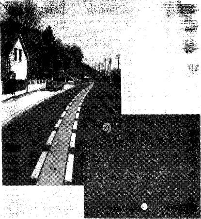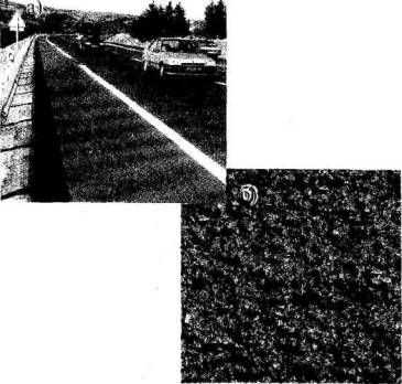 Рис. 18. Участок дороги из смеси сларри сил после двух лет эксплуатации: а - общий вид; б - текстура поверхности Эти слои часто укладывают при проведении профилактических мероприятий для содержания дорог. Возможность варьировать гранулометрический состав смесей, использовать модифицированные вяжущие, синтетические волокна и разнообразные пигменты, распределять эти смеси в один или два слоя позволяет применять их практически на любом покрытии с различной интенсивностью движения и грузонапряженностью. Следует отметить, что во Франции предъявляются более четко сформулированные требования в области выбора вяжущего, так как существует жесткая конкуренция между вязкими битумами прямой перегонки и полимербитумами. Для приготовления холодных смесей, используемых как для устройства защитных, так и для конструктивных слоев, применяется 35% вяжущего - полимербитума, в основном, с добавкой стирол-бутадиеновых стиролов (СБС) или различных видов каучука и резиновой крошки. В Южных Пиренеях использовали слой из смеси ms как промежуточный между слоем покрытия из асфальтобетона и классической поверхностной обработкой для улучшения сцепления и снижения уровня шума. При этом глубина шероховатости должна была оставаться на уровне поверхностной обработки. На участках дороги с высокой интенсивностью движения легковых автомобилей такая конструкция позволила значительно снизить уровень шума и выкрашивание щебеночных фракций из поверхностной обработки. В течение шести лет эксплуатации она имела хорошие эксплуатационные показатели. На участках с высокой интенсивностью движения грузовых автомобилей слой ms устраивали на битумной эмульсии (битум применялся с добавлением полимера). В этом случае после восьми лет эксплуатации состояние покрытия характеризуется как хорошее. На обоих участках этих дорог для ms применялся щебень размером зерен 0-4 мм, а для поверхностной обработки - 10-14 мм и 4-6 мм. На участках дорог с высокой интенсивностью движения, где наблюдалось сильное выкрашивание и начиналось интенсивное трещинообразование, хорошие результаты показал метод устройства двойного слоя из ms с добавлением синтетических волокон. Первый слой устраивался из щебня размером зерен 0-4 мм с расходом 8 кг/м2, а второй - из щебня размером зерен 0-6 мм с расходом 12-15 кг/м2. В течение пяти лет эксплуатации целостность покрытия была обеспечена, дефектов на поверхности слоя износа не наблюдалось. Во Франции на улицах городов и населенных пунктов смесь ms применяется уже более 10 лет. В этом случае кроме обычных целей (обеспечение шероховатости, водо- и износостойкости) важное значение приобретает критерий комфортности движения и снижение уровня шума. Кроме того, в населенных пунктах достаточно часто осуществляют замену и обновление дорожной разметки. Иногда это выполняется неряшливо и внешний вид дороги ухудшается. Устройство слоя ms позволяет решить эти проблемы, восстановить однородность поверхности покрытия и легко обновить разметку. Причем во Франции рекомендуется каждые семь лет заменять слои износа. Это относится как к смесям, укладываемым в холодном, так и в горячем состоянии. С точки зрения охраны окружающей среды, предпочтение отдается развитию методов холодной укладки защитных и шероховатых слоев. В то же время рынок тонких слоев горячей укл